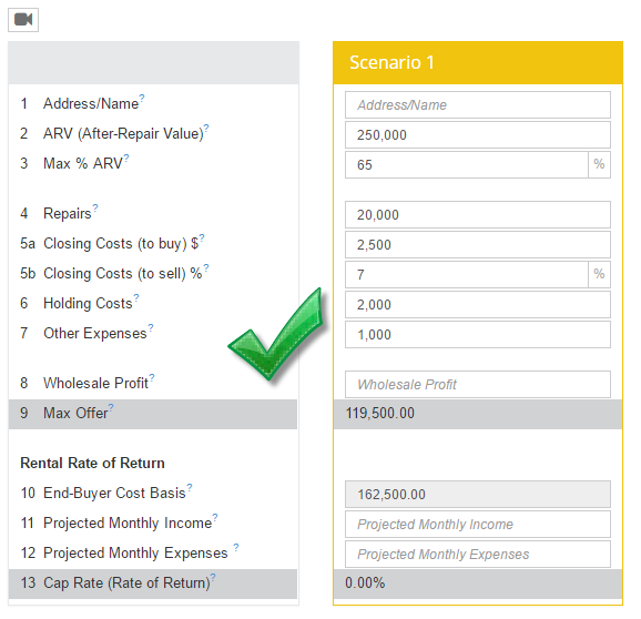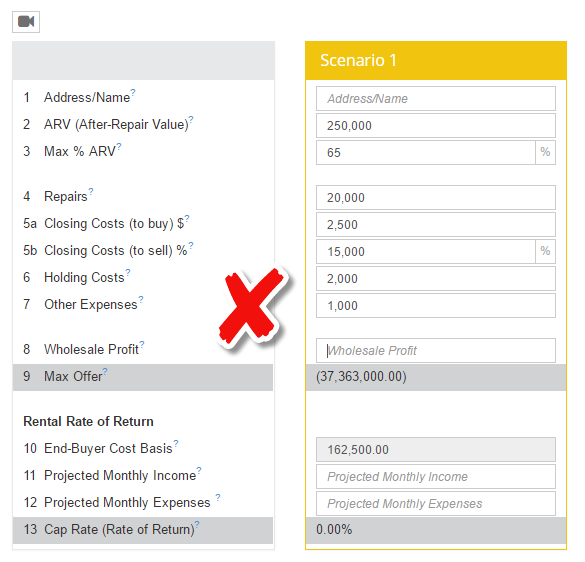Is your Max Offer (line #9 on the Quick Offer Calculator) WAY to high or low? A very common mistake is on line 5b. It needs to be a percentage (%) NOT a dollar ($) amount.