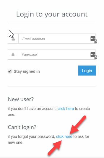 **Note: If you don't remember your password to login you can use the link below "Can't Login" on the Login page (see below). You'll get an email with a new temporary password.