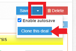 To clone your deal, towards the upper right-hand side of your deal analysis screen, you will see the blue save button with a little white arrow next to it. You'll want to click the white arrow and a drop-down will appear allowing you to select 'Clone this deal'.