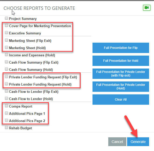 - 3) Select the reports that you want to use (these reports have spots to insert photos cover page, exec sum, marketing sheets, private lender funding req., addl’ pics page, comps report) and then hit generate.